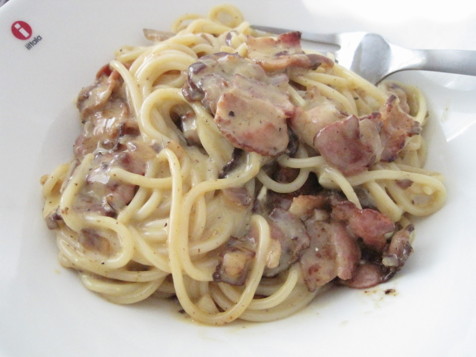 Silloin, kun tekee mieli jotain naurettavan rasvaista, naurettavan hiilarista ja naurettavan hyvää ruokaa, kannattaa tehdä pasta carbonaraa. Jos mun linjat kestäis, tekisin tätä ruokaa varmaan viikoittain. Tai no, ainakin kuukausittain, niin ei alkais heti kyllästyttämään. :) Variaatioita löytyy varmasti kymmeniä, mutta tärkeintä on varmaankin se, ettei keltuaiset kypsy, vaan ainoastaan lämpenee, kun kastike sekoitetaan keitettyyn spagettiin. Äh, kuola valuu...